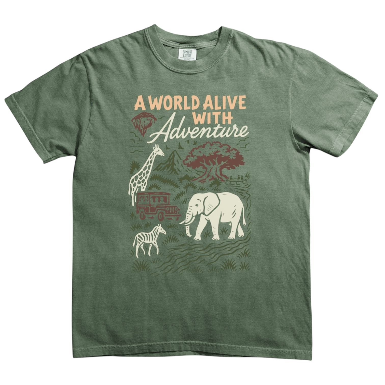 Created on Comfort Colors 100% Cotton T-Shirt, shade ivory and moss.